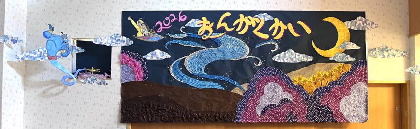 今回の音楽会の壁面は全クラスで作り上げた共同制作となっています。 ひよこ組 手形・花紙円め つくし組 花紙・折り紙円 ひばり組 チューリップ折り つぼみ組 雲のちぎり紙 ほほえみ組 つる折り ひかり組 バラ折り